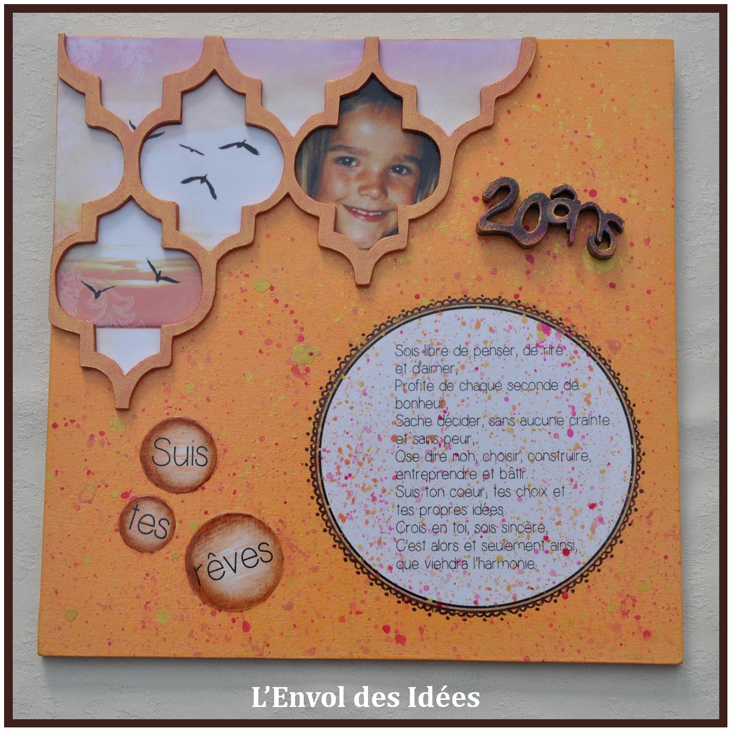 L’idée de faire une peinture en technique mixte m’a semblé évidente car je voulais intégrer sa photo enfant, un poème et du chantournage pour donner du volume.