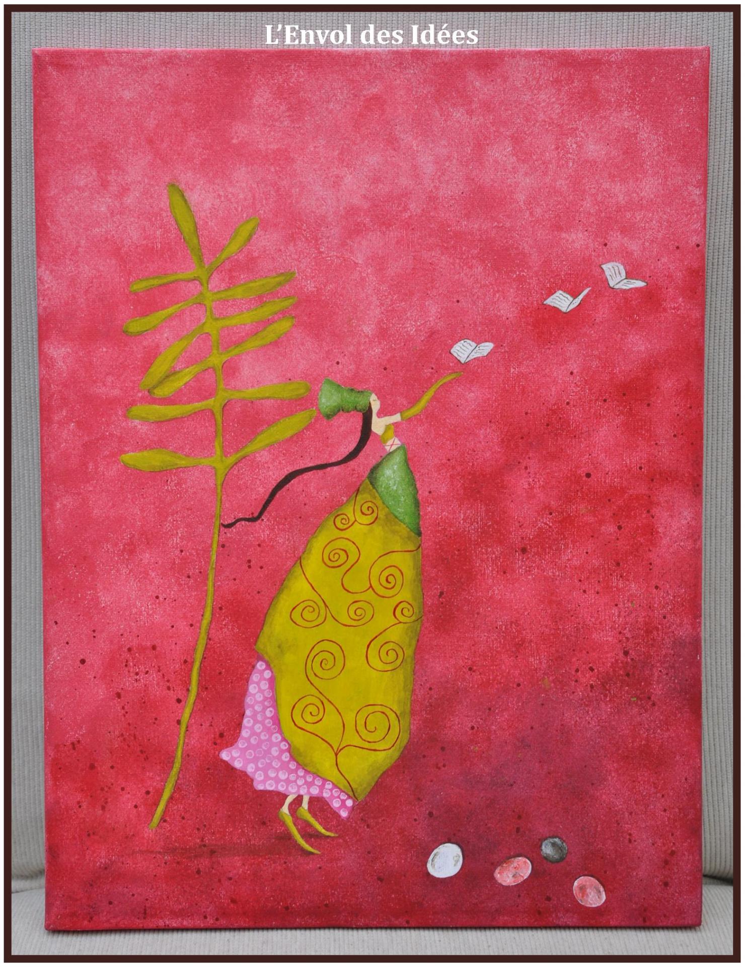 Cette peinture m'a donné du fil à retordre! Elle s'inspire d'une aquarelle de Gaëlle Boissonnard. J'ai eu beaucoup de mal à la réaliser car je devais me "lâcher", ce qui n'est pas mon fort. En fait, j'ai l'habitude de m'attacher énormément aux détails et ici, il ne fallait absolument pas ! J'y suis arrivée mais de manière laborieuse !
